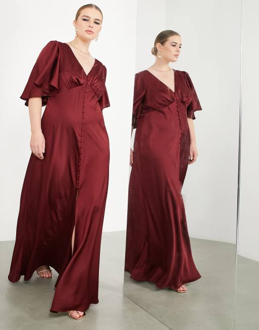 ASOS DESIGN Curve Bridesmaid satin flutter sleeve maxi dress with button front in wine BURGUNDY BURGUNDY ASOS Very well made.