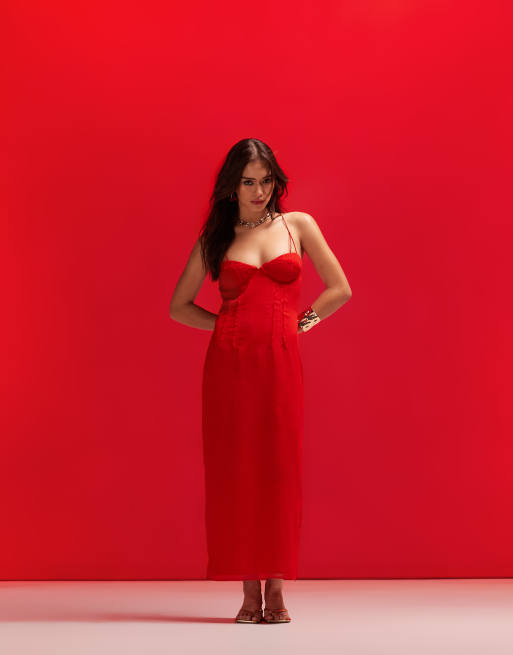 ASOS DESIGN Robe crayon mi longue en mousseline avec bonnets rembourres a empiecements et decoupe Rouge vif Very well made.
